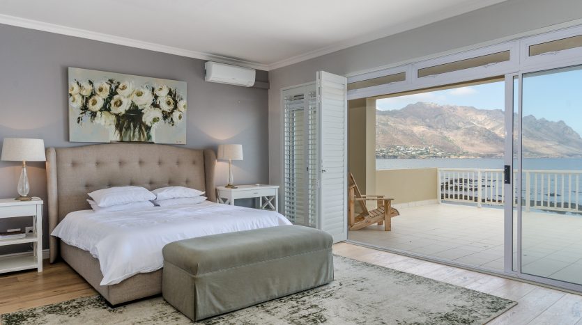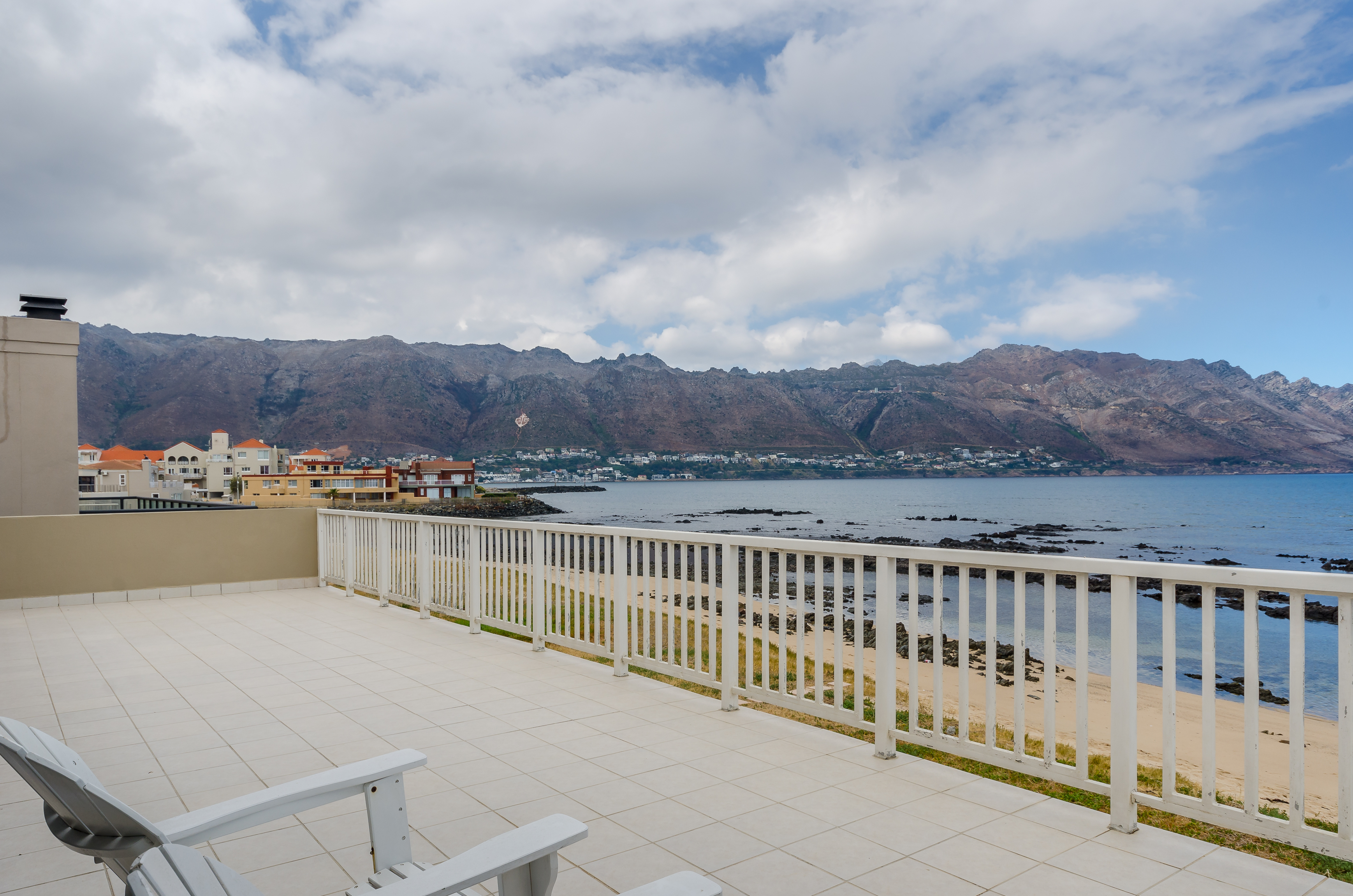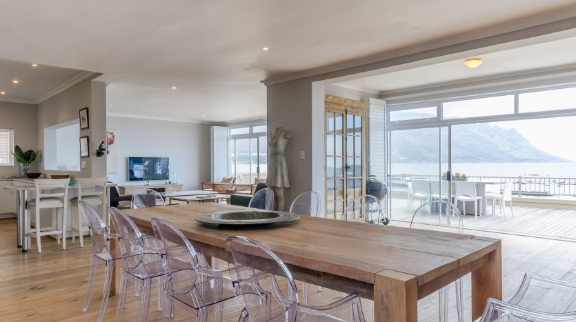 The spacious master bedroom has amazing sea and sunset views with the waves breaking within meters. The second living room upstairs can also be utilized as a 5th bedroom. Both these rooms walk out onto a huge balcony overlooking False Bay and the mountains.
