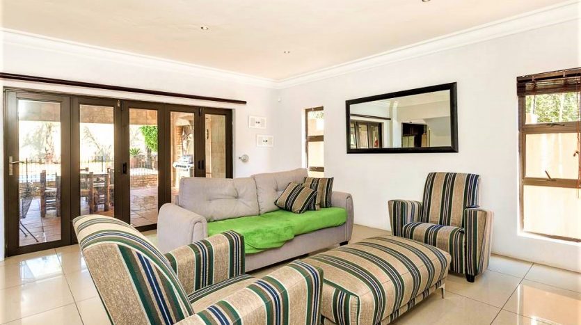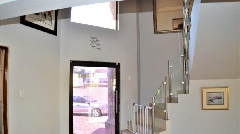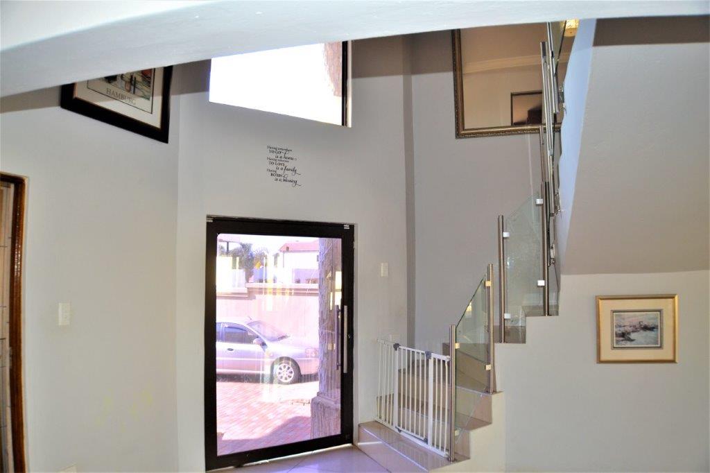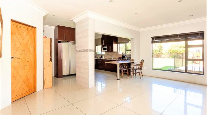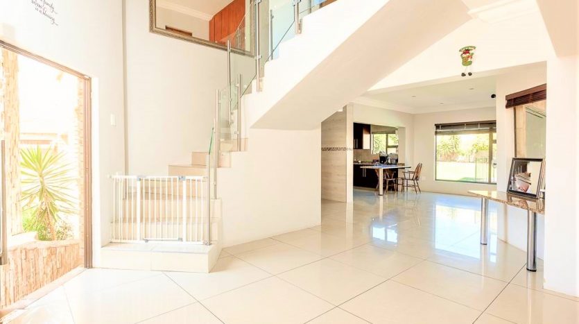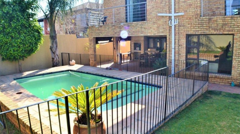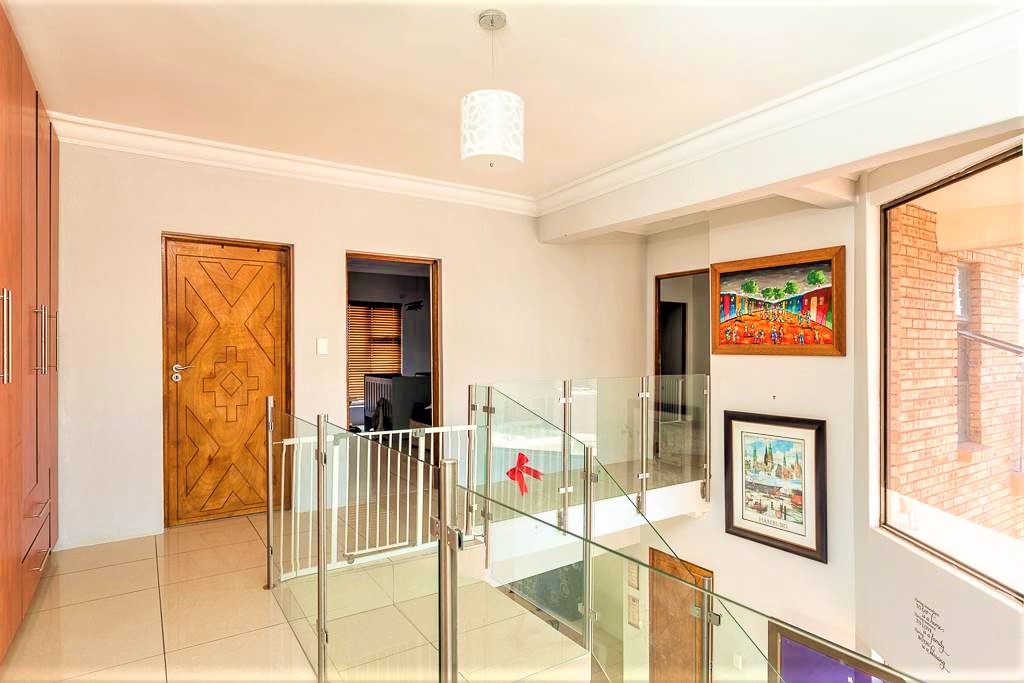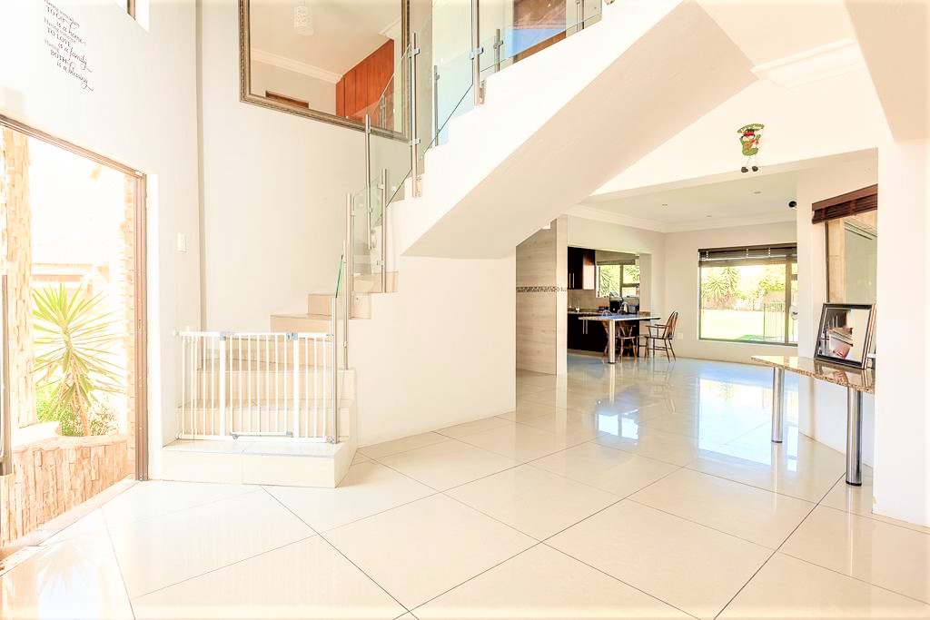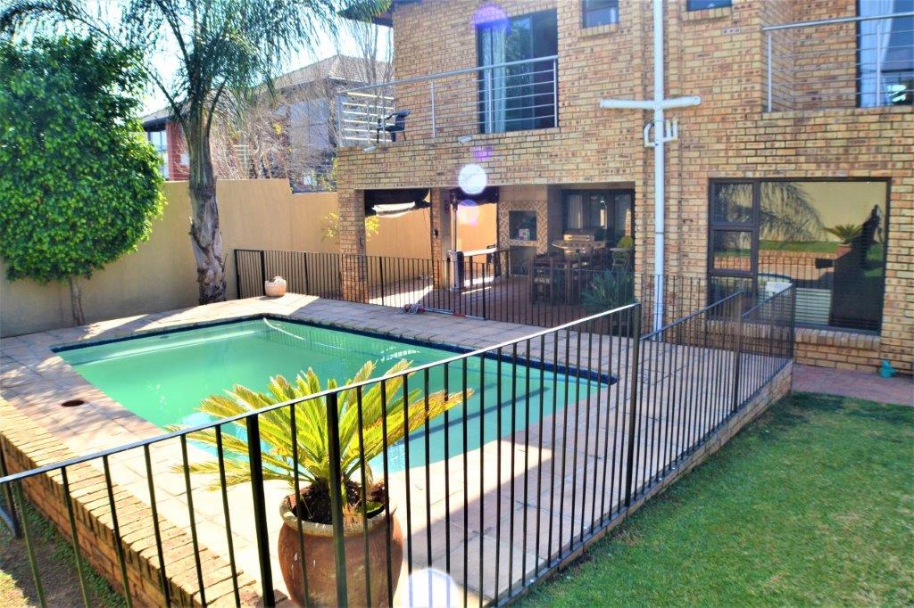 As you enter this home you are welcomed with a lovely entrance hall with your lounge to your right and open plan kitchen and dining area in front of you. The double garage and single garage lead into the home for your convenience. There is a study or office space on the ground floor. The lounge and dining area lead onto a relaxing patio with a fully kitted braai area and a stunning pool for those hot summer days.