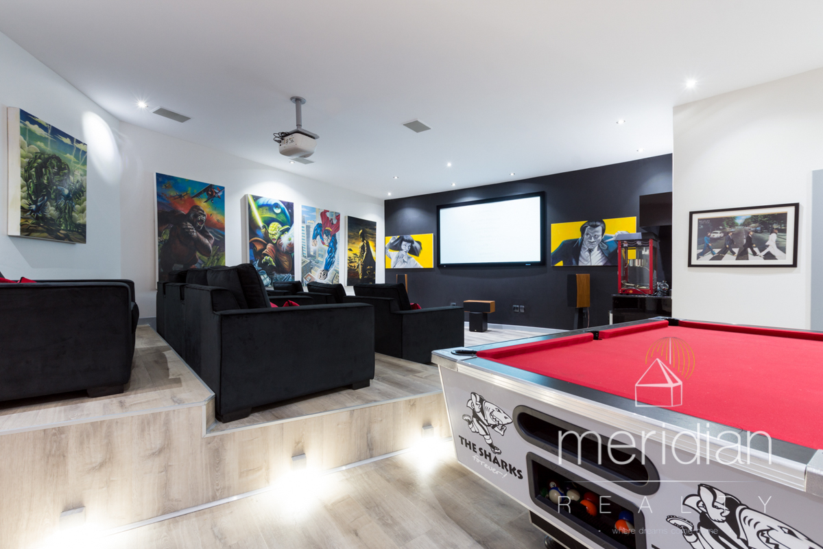 Downstairs there is a fully equipped theater room with surround sound system and game room. Additionally 2 bedrooms en suite with private lounge onto the garden.